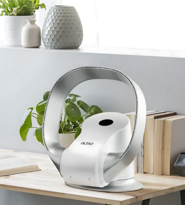 A super-shiny curved LED ring envelopes a concealed fan, creating a sculptural focal point perfect for dining tables. The wrap-around illumination offers glare-free ambience, while the hidden aerodynamics deliver gentle, even airflow without disturbing your décor.